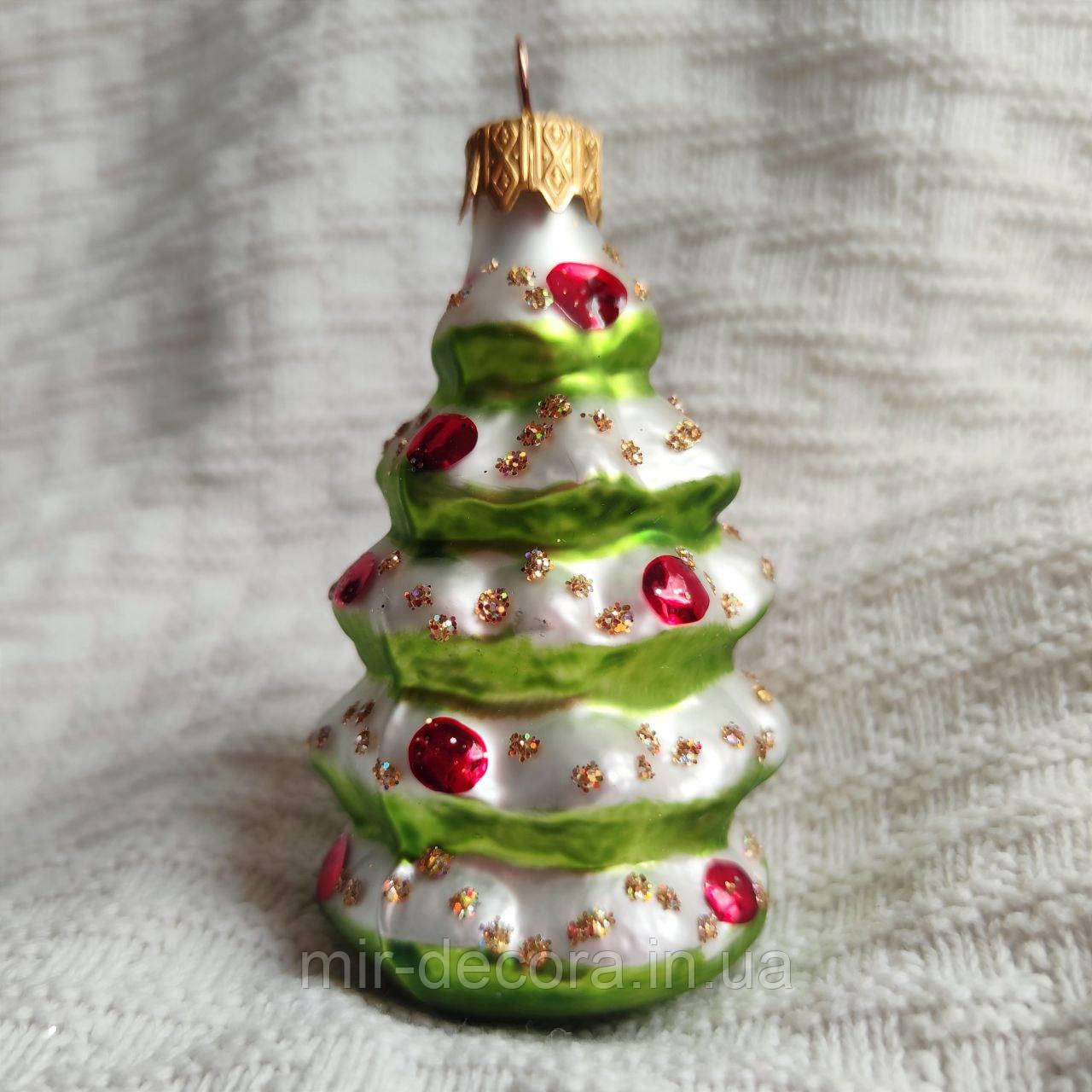 Іграшка скляна формова Ялинка. Висота 8 см. Декорована золотистим присипком із глістером. Упакована в папір.
