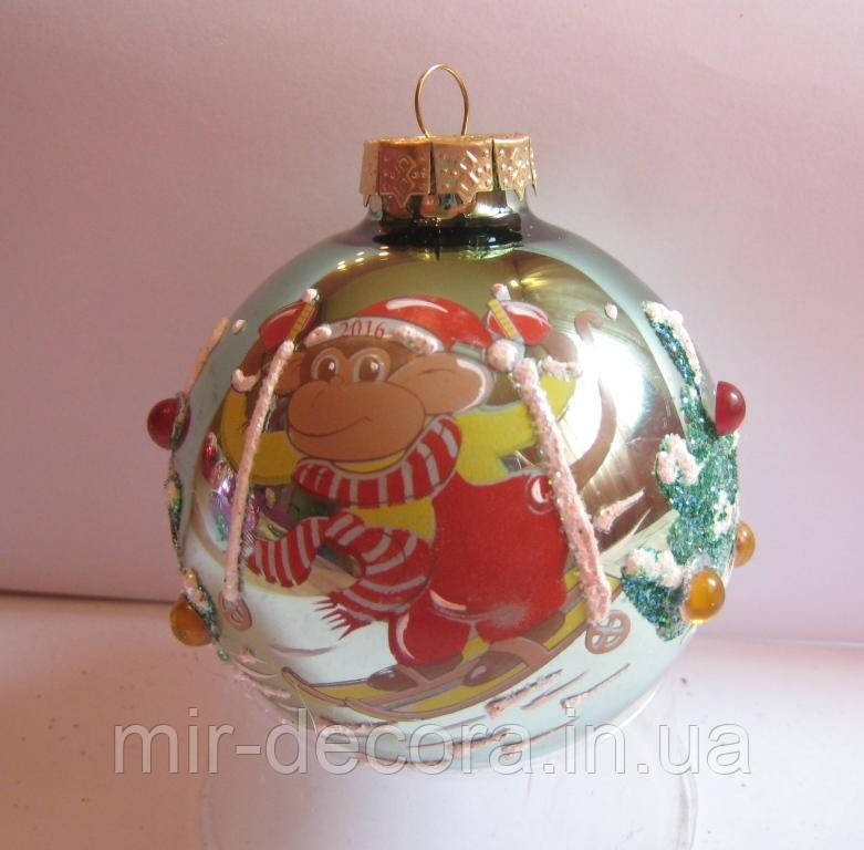 Куля скляна діаметром 65 мм із малюнком — символом 2016 року — ПЕРЕМОГИНОЮ. Упакований у папір. Кольори в наявності: світло-зелений глянець. Ручний розпис.