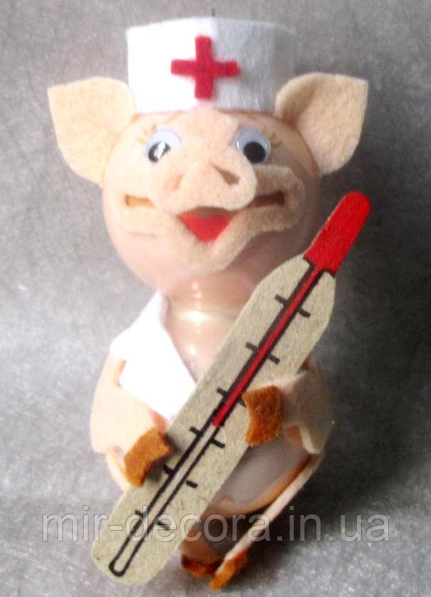 Іграшка скляна формова Порося в шапочці лікаря. Висота 13 см, ширина 7 см. Символ року. У виготовленні також використані фетр, стрічка, дерево.