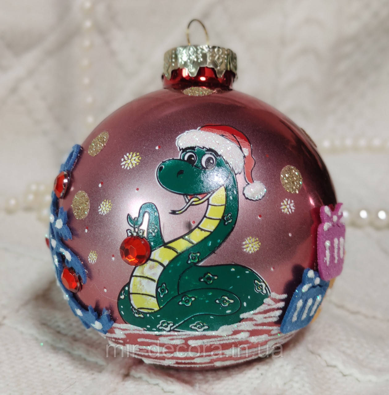 Ялинкова іграшка — скляна куля діаметром 85 мм. Художній розпис. Декорований присипкою білого та зеленого кольору з глістером. З символом року 2025 — Змією. Колірна гама в асортименті.