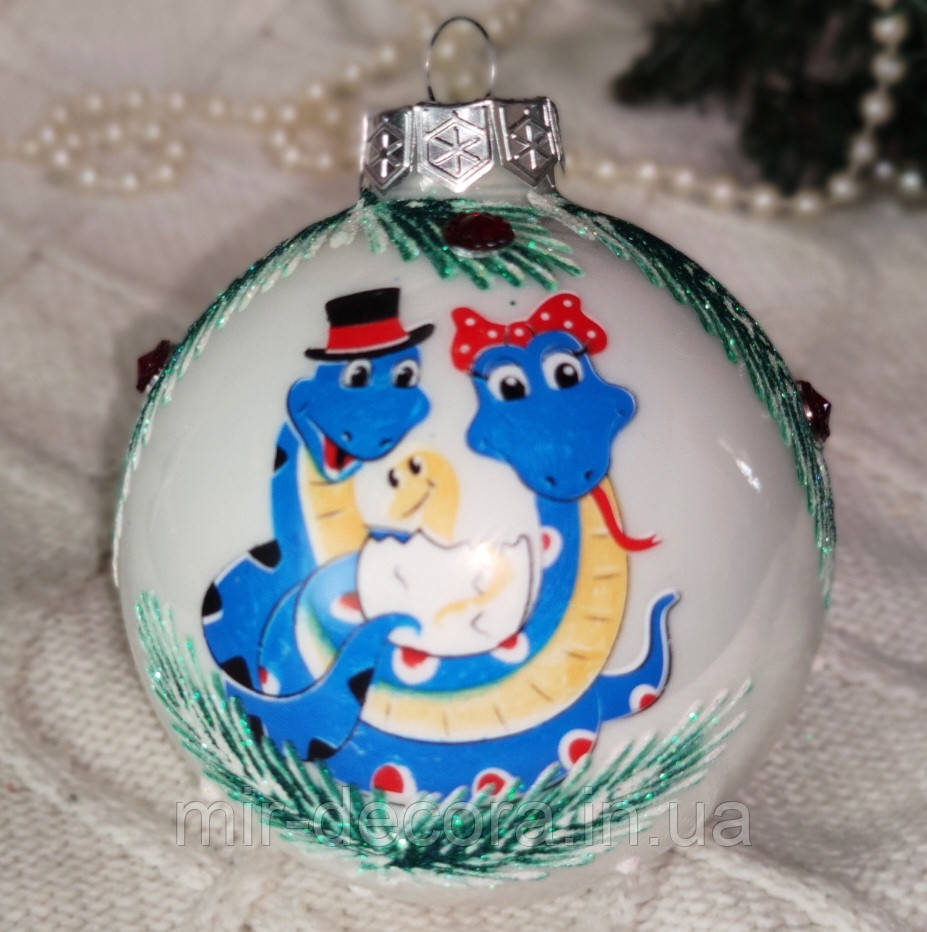 Ялинкова іграшка — скляна куля діаметром 85 мм. Художній розпис. Декорований матеріалами, що надають обсягу, а також присипкою білого та зеленого кольору з глістером. Символ року 2025 — Родина Змій. Колірна гама в асортименті